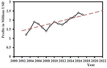 The third situation involves forecasting the profit out of available data. Let, for example, the company’s profits during the past 15 years (starting from 2003) be represented by the given broken line chart. To forecast the probable profit in 2022, a method known as linear regression is used. In this method, a hypothetical straight line is passed across the points, using certain rules. Once this line is plotted, one can forecast the probable figure for profits in that year. The forecasted figure is about 2.5 million USD (MUSD).