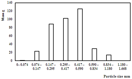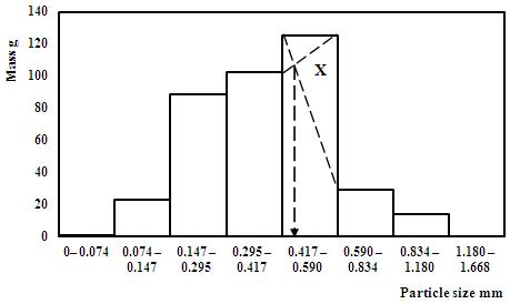 We note that the particle size range with the highest mass lies is in the range 0.417 – 0.59 mm. To get a more precise value, the gap between the bars is reduced to zero as in Figure (2). Then, we draw two segment lines, the first joins the upper left corner of the bar with highest mass (X) to the upper left corner of the bar to its right. The second line joins the upper right corner of the bar (X) to the upper right corner of the bar to its left. The intersection of the two segment lines represents the value of the mode. This value is about 0.45.