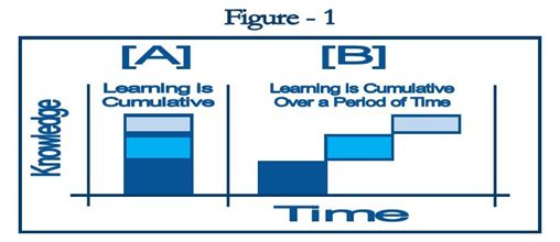 A teacher’s first task will be to understand the nature of learning. In simple terms, learning is cumulative and needs time to take place. Learning is also acquired in steps – one piece of information after another (1). See the figures below (figures – 1,2 & 3).