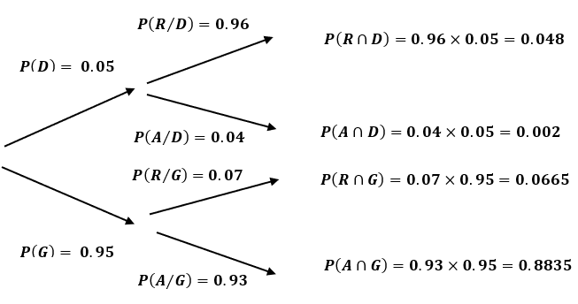 Now, let’s designate by D a defective component and by G a good one. Alos, let A be an accepted component and R a rejected one. Following the heading of the problem, the following diagram can be drawn: